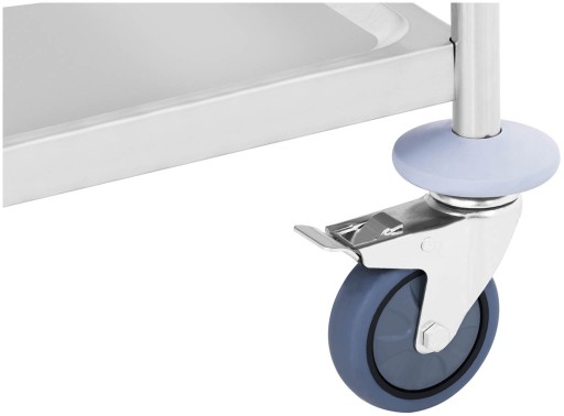 Model wózka transportowego RCBW 2 wyróżnia się relingami (barierkami) przy każdej półce. Zapewniają one wygodny transport np. szklanek oraz kieliszków. Odstęp między półkami wynosi 480 mm, dlatego mebel idealnie sprawdzi się do przewożeniu wysokich naczyń. Dodatkowo, został wyposażony w gumowe koła o średnicy 100 mm, które obracają się o 360°. Od spodu umieszczono maty, które niwelują drgania oraz wygłuszają dźwięk.