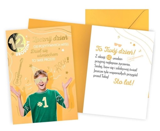 W powiększonym tzw. Angielskim formacie 140x190 mm. Wykonany z niezwykłą dbałością o szczegóły, zdobiony. Wewnątrz znajduje się tekst życzeń, a całość uzupełnia dopasowana kolorystycznie koperta. okazja: Urodziny