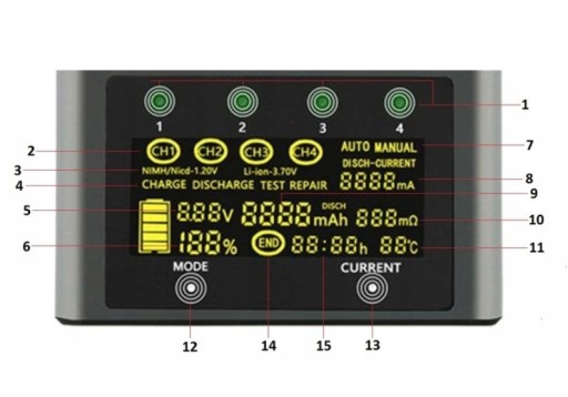 - Przycisk CURRENT - wybór prądu ładowania / rozładowania;