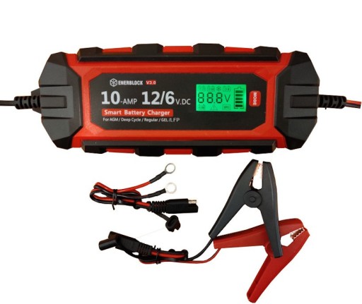 ENERBLOCK ENR12-10 to w pełni automatyczna profesjonalna ładowarka mikroprocesorowa przeznaczona do ładowania tradycyjnych akumulatorów kwasowo-ołowiowych, żelowych (GEL), AGM, EFB (Start-Stop), VRLA o napięciu 12V oraz pojemności od 4AH do 200AH.