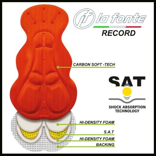 Wkladka Record Carbon, to profesjonalna wkładka stosowana w spodenkach kolarskich. Dzięki zróżnicowanej gęstości i grubości poszczególnych fragmentów wkładki oraz ich odpowiedniemu wyprofilowaniu, uzyskuje się efekt najbardziej optymalnego podparcia odpowiednich miejsc ciała, co zwiększa komfort jazdy. W optymalnym dopasowaniu wkładki do ruchów rowerzysty pomaga jej doskonała rozciągliwość we wszystkich czterech kierunkach. Zawarte w materiale wkładki bioaktywne jony srebra zahamowują wzrost flory bakteryjnej i zapobiegają powstawaniu nieprzyjemnych zapachów. Natomiast całkowity brak szwów sprawia, że wkładka nie powoduje podrażnień.