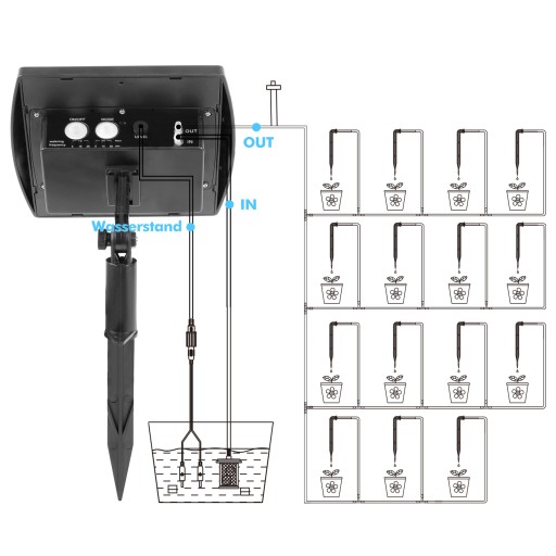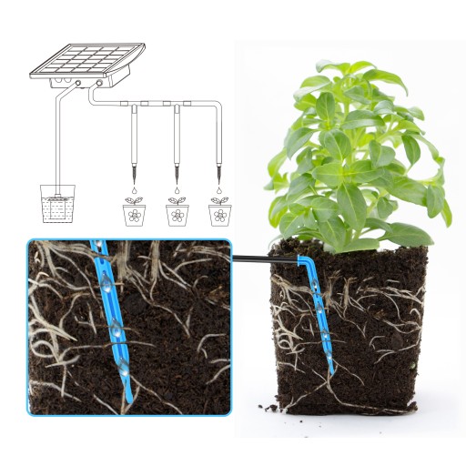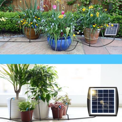 Zestaw do automatycznego nawadniania kropelkowego: Nasz nowy system nawadniania zasilany energią słoneczną składa się ze sterownika, pompy, timera, węża i małej kielni, które automatycznie podlewają rośliny o ustalonych porach i automatycznie powiadamiają o zatrzymaniu pompy lub niskim poziomie wody w zbiorniku. Specjalnie zaprojektowany do podlewania na wakacjach, przy napiętych harmonogramach i zmiennych warunkach pogodowych.