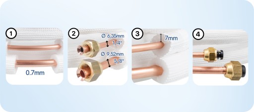 ✅ ZACIŚNIĘTE KOŃCÓWKI RUR - Rura miedziana jest już przygotowana z nakrętkami i zakielichowanymi końcami, co ułatwia i przyspiesza montaż klimatyzacji.