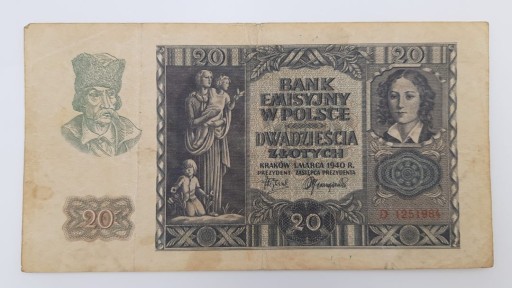 Oferta dotyczy banknotu 20 zł z 1940 roku widocznego na zdjęciach.
