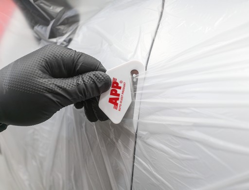Ręczny obcinak folii do maskowania. Umożliwia szybkie obcięcie potrzebnej długości folii oraz precyzyjne wycięcie zbędnego fragmentu osłony z powierzchni elementu podlegającego naprawie. Dzięki wbudowanemu magnesowi przecinak można przyczepić do stalowych elementów np. stojaka do folii. Ostrze obcinaka wykonane jest z hartowanej nierdzewnej stali 420J2.