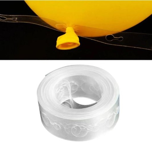 Taśma do robienia girland z balonów. Niezastąpiona do tworzenia ścian balonowych, łuków, girland itp.,- posiada dwa oczka, dzięki czemu jeszcze łatwiej utworzysz dekoracje. Wystarczy zawiązany balon przełożyć przez duże oczko i przesunąć na bok w mniejsze.