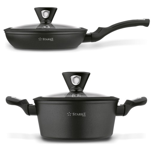 Nieprzywierający komplet garnków na indukcję z pokrywkami Starke Pro Dark 10 elementów jest aluminiowy, ma grube ścianki i chroni jedzenie przed przywieraniem. Rodzaj korpusów, który wykorzystuje, wykuto na gorąco z pojedynczego arkusza metalu techniką forged. Dzięki temu 3 garnki i 2 patelnie – 24 i 28 cm – są bardzo solidne oraz dobrze przewodzą ciepło. Są też świetnie wyważone, co w połączeniu z nienagrzewającymi się i antypoślizgowymi uchwytami soft touch da ci wysoki poziom komfortu użytkowania. Zestaw działa na każdym typie kuchenki, ponieważ korzysta z dna indukcyjnego o grubości 3,2 mm. Sprawia ono, że robienie posiłków jest szybsze, a przy tym energooszczędne. Trwałość powierzchni wewnętrznej naczyń z kolekcji Dark opiera się na dwuwarstwowej powłoce marmurowej non-stick AEROLITE (grubość 50-65 mikrometrów). Nie zawiera szkodliwych substancji (np. PFOA), jest twarda, charakteryzuje się doskonałą przyczepnością i naturalną fakturą oraz może znieść do 50 000 cykli ścierania. Ułatwia też pielęgnację (nie do zmywarki, tylko mycie ręczne). W komplecie otrzymujesz również 5 szklanych pokrywek dedykowanych z silikonowymi rantami. Dzięki nim możesz dusić jedzenie i wygodnie regulować ilość pary wodnej wewnątrz garnków lub patelni. Seria Starke Pro Dark z powłoką granitową typu stone była testowana także przez zawodowego szefa kuchni, Piotra Kucharskiego. Poleca on ją do wieloletniego użytku w domowej kuchni.