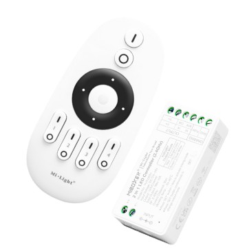ZESTAW składa się z sterownika MiBoxer FUT035S+ do taśm jednokolorowych oraz CCT, pilota i baterii do pilota.