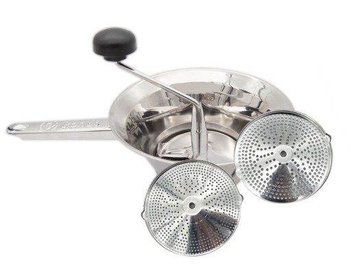 Przecierak do warzyw i owoców wykonany z wysokiej jakości stali. Posiada dwa wymienne sitka o różnej średnicy oczek. Produkt w 100% bezpieczny, przeznaczony do kontaktu z żywnością. Materiał wykonania wpływa na jego lekkość, dzięki czemu użytkowanie przecieraka jest łatwe i wygodne. Uchwyt z otworem do zawieszenia pewnie leży w dłoni, jest poręczny. Łatwy w utrzymaniu czystości. Przecierak posiada specjalne metalowe podpórki, umożliwiające łatwy montaż na misce lub garnku.