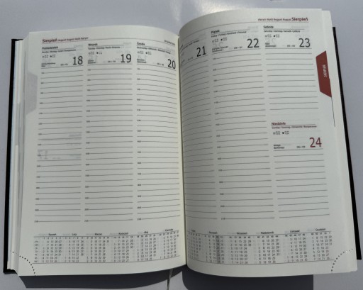 Elegancki i praktyczny zarazem. Ten kalendarz ma wnętrze szyte oraz dodatkowo klejone i wzmocniony krepą - dzięki temu jest to produkt dobrej jakości, który z pewnością będzie służył użytkownikowi przez cały rok.