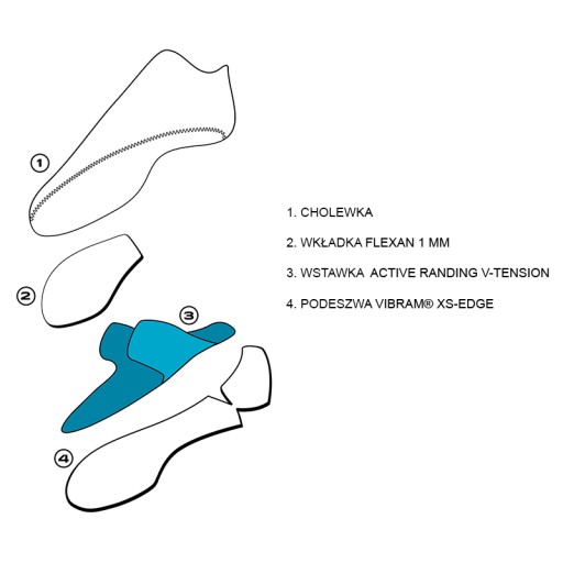 - Wkładka Flexan 1 mm w przedniej części buta wspiera stopę na krawędziach;