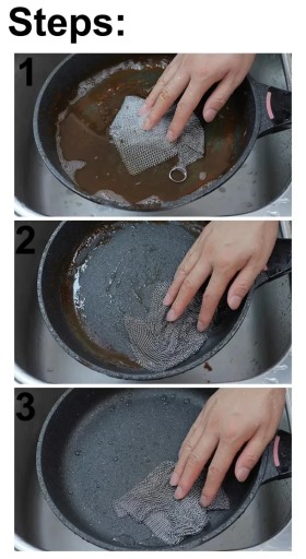 - Wytrzymała nylonowa powierzchnia druciana, bawełniane włókna ze stali nierdzewnej i inne właściwości czyszczące pozwalają szybko usuwać różne uporczywe plamy.