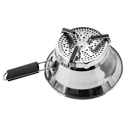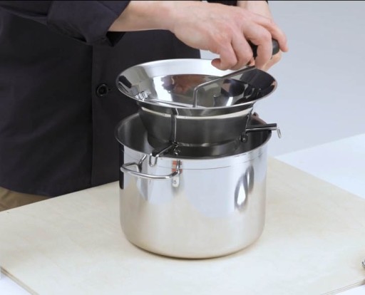 Posiada specjalne nóżki, które pozwalają na postawienie przecieraka ponad garnkiem. Nóżki są uniwersalnego rozmiaru oraz posiadają gumy zapewniające stabilizację.