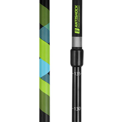 Parametry: - materiał: aluminium - ilość sekcji: 2 - rączki: PP - mocowanie rękawiczki: standardowe - zapięcie sekcji kija: wewnętrzne - amortyzacja: tak - grot: widłowy - talerzyk: wymienny - waga (2 kije): 440 g - długość: 105 - 135 cm - po złożeniu: 85 cm - dodatkowo: gumowe końcówki do kijów Elementy odblaskowe dla poprawy bezpieczeństwa.