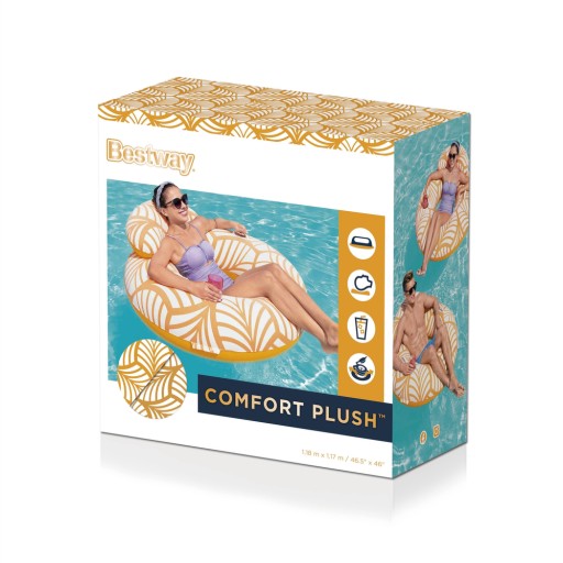 Luksusowa i wodoodporna powierzchnia przypominająca aksamit Comfort Plush™ Kolor materiału rozjaśnia się i intensyfikuje w wodzie Wygodny zagłówek Wytrzymałe uchwyty 1 uchwyt na kubek Zawartość: 1 rurka do pływania, łatka naprawcza