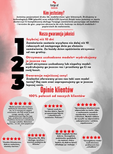 Należy pamiętać, że w każdej ofercie pierwsze zdjęcie przedstawia render modelu 3d, a nie wydrukowany model. W przypadku większej ilości modeli ukazanych na zdjęciu proszę o informację o interesujących wzorach (oznaczenia literowego lub cyfrowego, a w przypadku ich braku opisu modelu np. pierwszy z lewej). Jeżeli inaczej nie wskazano w ofercie model nie zawiera podstawki, ani jej elementów scenicznych. Stosujemy szary kolor żywicy, jednak w przypadku jej braku może zostać zastosowany inny kolor w stosunku do całości lub części modelu. Nie wpływa to jednak na nałożenie podkładu oraz malowanie. Wydrukowane modele są oczyszczone i utwardzone, jednak wymagają sklejenia i przygotowania przed malowaniem. Mimo naszej kontroli jakości modele mogą posiadać mikrosupporty lub drobne ich pozostałości wymagające usunięcia(np. cążkami lub skalpelem) oraz mikroubytki po nich.