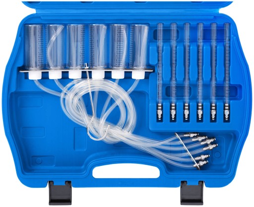Za pomocą testera przelewowego wtryskiwaczy MSW można szybko i łatwo określić ich objętość powrotną. Dzięki licznym adapterom ten obszerny zestaw narzędzi jest odpowiedni dla prawie wszystkich wtryskiwaczy i nie powinno zabraknąć go w żadnym warsztacie. Tester jest łatwy i elastyczny w użyciu. Pomiar każdego wtryskiwacza jest precyzyjny i dokładny. Węże przyłączeniowe montuje się bezpośrednio na praktycznych naczyniach pomiarowych. Gdy tester common rail nie jest używany, wystarczy schować wszystkie przybory do plastikowej walizki transportowej.