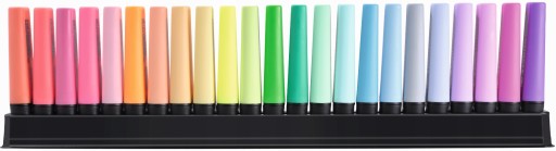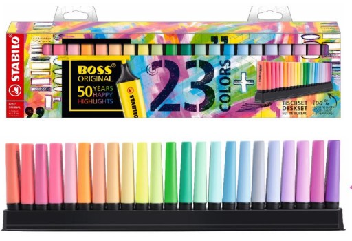 STABILO BOSS ORIGINAL - prawdziwy klasyk wśród zakreślaczy i niedościgniony wzór! Dostępny jest w 9 kolorach neonowych a także w 14 kolorach pastelowych. Razem aż 23 możliwości do wyboru. Grubość linii od 2 do 5 mm pozwala na zakreślanie tekstów o różnej wielkości. Nadaje się też do pisania, ozdabiania, hand letteringu. Technologia Anti-dry zabezpiecza tusz przed zasychaniem, dzięki czemu można go używać nawet przez 4 godziny i mieć pewność, że nie zaschnie. W trosce o środowisko wszystkie czarne elementy zakreślacza wykonane są z plastiku pochodzącego z recyklingu. Opakowanie to plastikowe etui zawierające 23 szt. zakreślaczy (9 w kolorach neonowych i 14 w kolorach pastelowych). Zakreślacze w etui ustawione są na praktycznej szynie, która może też być podstawką na biurko.