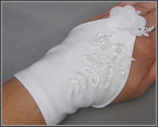 Komplet komunijny. Rękawiczki zakładane na jeden paluszek, torebka komunijna w kształcie woreczka z perłową rączką, wykonana z satyny ślubnej wysokogatunkowej. Ozdobiona koronkową aplikacją z szyfonowym kwiatkiem 3D, bogato zdobionym perełkami, cekinami i koralikami. Torebka posiada wkładkę pomagającą w zachowaniu jej kształtu nawet po obciążeniu. Na pozostałych aukcjach można do kompletu dobrać opaskę na włosy, okapnik na świecę lub stroik na grzebyku ozdobione taką samą aplikacją.
