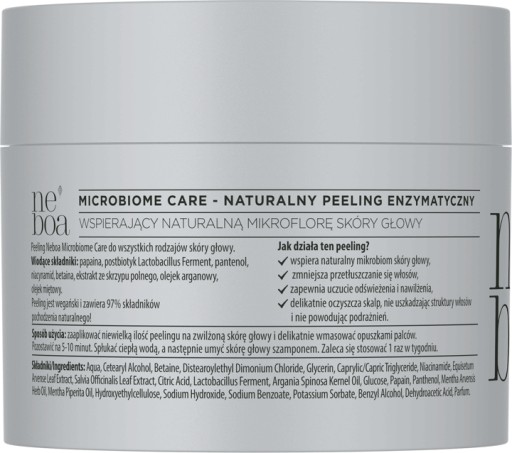 Peeling bogaty w papainę delikatnie złuszcza martwy naskórek, oczyszcza i odświeża skalp. Ekstrakt z mięty pieprzowej i ekstrakt z szałwii pobudzają mikrokrążenie, hamują proces wypadania włosów, widocznie przyspieszają ich porost. Betaina i pantenol nawilżają i łagodzą skalp. Postbiotyk wspiera naturalny mikrobiom skóry głowy.