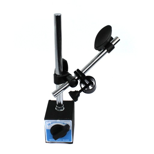 Z mechanizmem ustawiania dokładnego w górnym uchwycie. Wyposażony w otwór na osadzenie czujnika zegarowego, oraz rowek trapezowy do czujnika wychylnego dźwigniowego. Centralne blokowanie pokrętłem jednocześnie dolnego, środkowego i górnego przegubu. Podstawa magnetyczna z rowkiem pryzmatycznym od spodu.