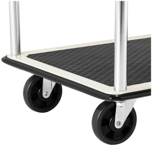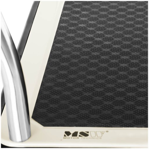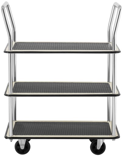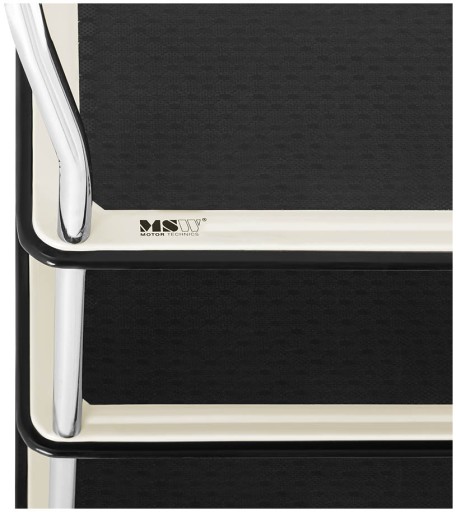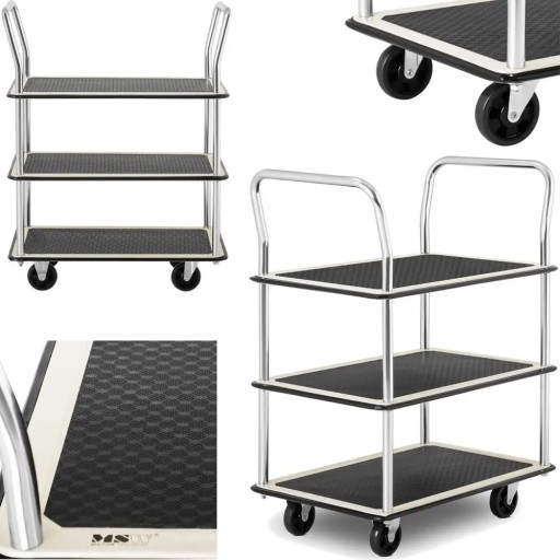 Wózek półkowy marki MSW sprawdzi się w hotelach, sklepach, magazynach, hurtowniach do przewożenia ciężkich przedmiotów o różnej wielkości. Konstrukcja wózka wykonana została ze stali, jej nośność wynosi 150 kg. Trzy półki z antypoślizgowymi matami o wymiarach 72 x 43 cm będą odpowiednie także do dłuższych ładunków. Po obu stronach wózka znajdują się ręczne uchwyty wykonane ze stali. Cztery gumowe kółka o średnicy 10 cm (w tym dwa skrętne) umożliwiają bezproblemowe manewrowanie wózkiem. Wózek jest łatwy w konserwacji i czyszczeniu.