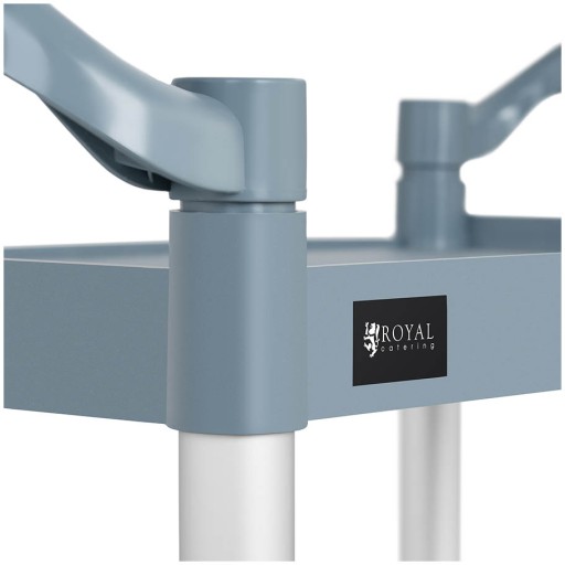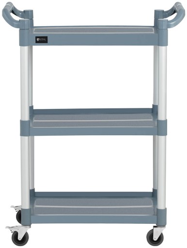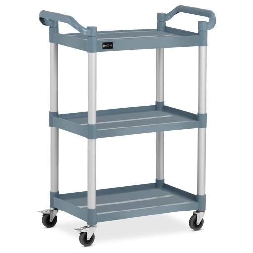 Wózek kelnerski marki Royal Catering sprawdzi się do rozwożenia posiłków czy zbierania naczyń w hotelach, restauracjach czy na stołówkach. Uniwersalny wygląd oraz wytrzymała konstrukcja pozwalają także na wykorzystanie go do przewożenia przedmiotów w domu czy w ogrodzie. Wózek posiada nośność 90 kg, po 30 kg na półkę. Wykonany został z PP, trwałego, odpornego na działanie wody i łatwego w czyszczeniu. Odległość między poziomami wynosi 365 mm. Kompaktowa konstrukcja jest łatwa do samodzielnego złożenia. Każda z 3 półek ma wymiary 630 x 400 mm. Aluminiowe słupki zapewniają mu stabilność. Wózek wyposażono w 4 skrętne kółka o średnicy 100 mm z TPR (360°), 2 z nich posiadają hamulce. Poręczne uchwyty ułatwiają jego prowadzenie.