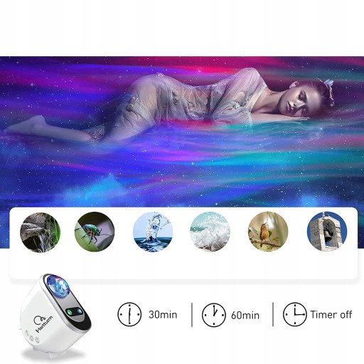 - Opierając się na solidnej konstrukcji, lampka nocna projektora Aurora dodaje białe półksiężycowe, wielokolorowe i gładsze źródło światła.