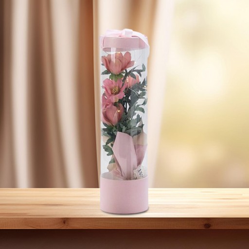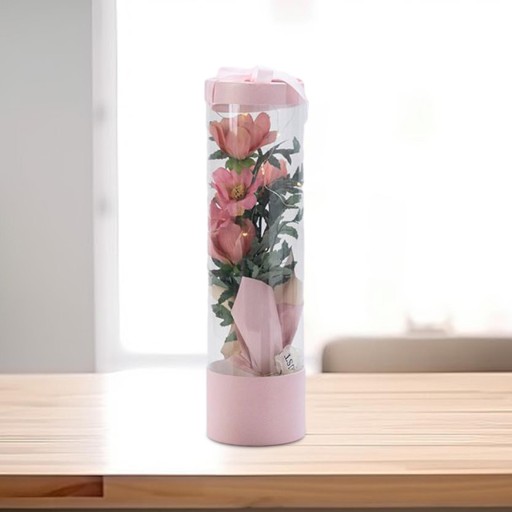 [Pudełko na bukiety]: Nasze pudełko na prezenty z kwiatami to przezroczysty cylinder wykonany z PCV, idealny na prezent na pojedynczą różę lub bukiet na Walentynki.