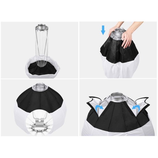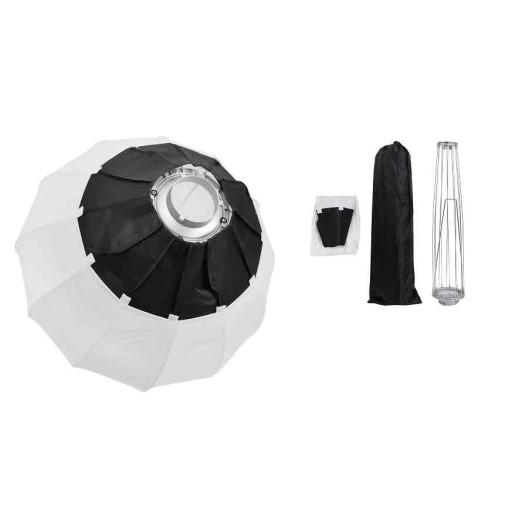 W zestawie znajduje się softbox w kształcie kuli, który można łatwo zamocować na lampie za pomocą systemu na rzep. Stelaż softboxa jest składany, co ułatwia transport i przechowywanie.