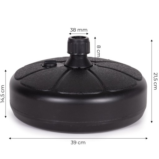 W górnej części podstawy znajduje się odkręcany korek, po jego wykręceniu należy napełnić podstawę wodą. Wypełnione wodą obciążenie waży ok 13kg, co zapewnia idealne obciążenie stabilizujące parasol.