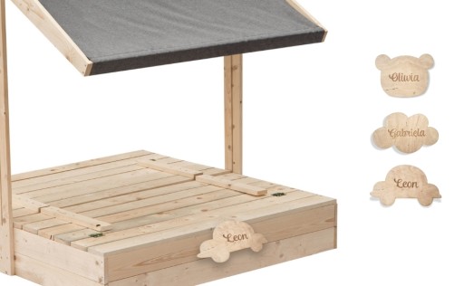 Możesz spersonalizować piaskownicę Flumi poprzez umieszczenie na niej tabliczki z imieniem dziecka lub wybranym przez siebie tekstem! Do wyboru są 3 kształty plakietki: