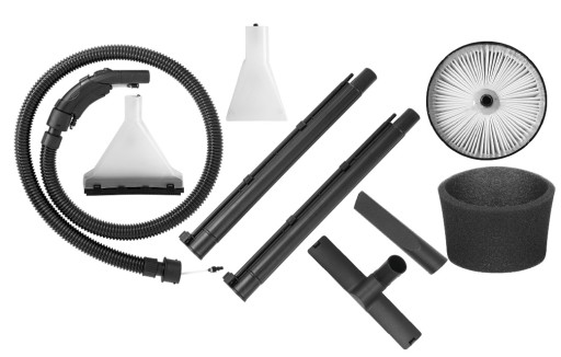 Zawartość zestawu: odkurzacz, wąż elastyczny, rura przedłużająca x2, końcówka piorąca wąska, szczotka piorąca, końcówka wąska, szczotka do podłóg, filtr x2