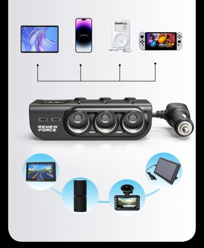 3 GNIAZDA ZAPALNICZKI O MAKSYMALNEJ MOCY 120W Rozdzielacz jest wyposażony w trzy gniazda zapalniczki, które mogą obsłużyć urządzenia o maksymalnej mocy 120W. Dzięki temu możesz podłączyć i zasilać jednocześnie różne urządzenia, takie jak nawigacja GPS, kamera samochodowa, przenośny odtwarzacz DVD i wiele innych. Wszystko to bez obaw o przeciążenie układu elektrycznego.