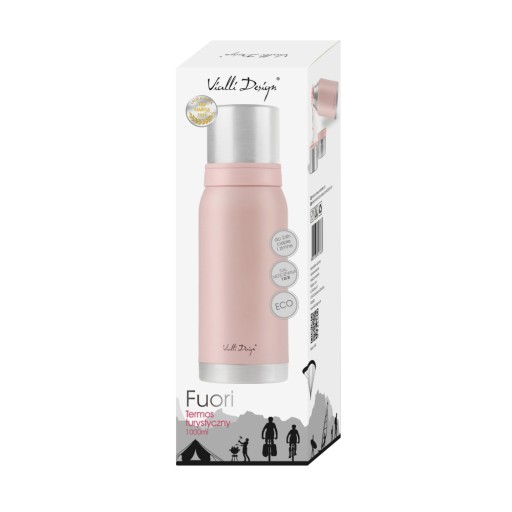 Termos turystyczny Fuori dostępny jest w pięciu wariantach kolorystycznych. Możemy wybierać pomiędzy białym, różowym, granatowym, zielonym i grafitowym. Produkt wyróżnia się nowoczesnym designem, wygodnym kształtem oraz stuprocentową szczelnością – takie połączenie to gwarancja zadowolenia każdego klienta. Termos firmy Vialli Design został dodatkowo zaopatrzony w dwa kubki o pojemności 150 ml i 200 ml.