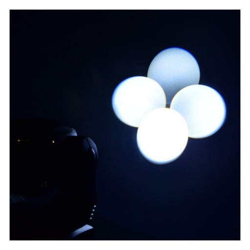 W tylnej części podstawy głowicy znajduje się gniazdo zasilania oraz wejście i wyjście do podłączenia przewodów przesyłających sterujące sygnały DMX. W części przedniej mieści się panel sterowania w postaci cyfrowego wyświetlacza LED oraz czterech przycisków (Menu, Up, Down, Enter). Za ich pomocą możemy wybrać jeden z czterech trybów pracy reflektora: