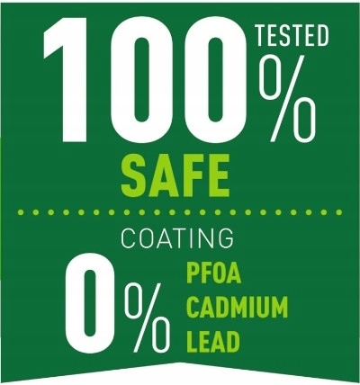 Bez PFOA, ołowiu i kadmu! Naczynia poddawane bardziej rygorystycznej kontroli niż wymagana przez przepisy w zakresie dopuszczalności do kontaktu z żywnością. Zero ołowiu i kadmu w powłoce oznacza brak celowego dodawania Pb i Cd do powłok. Brak migracji na poziomie 0,005 mg/kg.