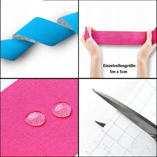 Taśma jest hipoalergiczna i nie zawiera lateksu, co zapewnia bezpieczeństwo stosowania. Ma również właściwości wodoodporne, przez co mogą być używane przez kilka dni. Tejp jest łatwa do docięcia, dlatego można ją dostosować do własnych potrzeb.