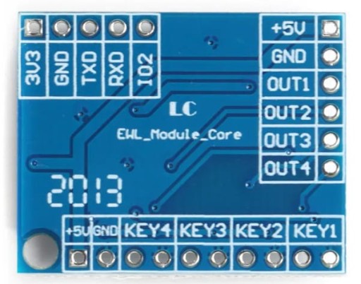 - KEY1..4 - wejścia, zwarcie dwóch pinów powoduje włączenie odpowiedniego wyjścia modułu lub podanie stanu niskiego