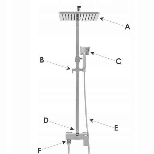 Rodzaj zestawu: Naścienny, dwu otworowy, z przełącznikiem, z deszczownicą o wymiarach 20 x 20 cm i słuchawką prysznicową