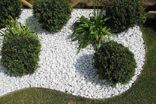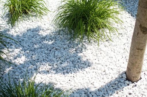 Barwa żwiru Bianco Carrera świetnie podkreśli zarówno kwiatowe rabaty, jak i krzewy, czy trawy ozdobne. Wdzięcznie mieni się w słońcu i połyskuje po deszczu.