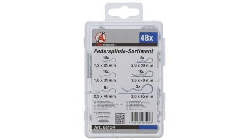 Zestaw zawiera 48 sztuk zawleczek w kilku najbardziej popularnych rozmiarach.