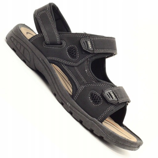 Męskie sandały zapinane na rzep w kolorze czarnym na płaskim spodzie. Idealnie sprawdzą się jako obuwie na co dzień w letnie, upalne dni. Prosty fason dopasuje się tęgości stopy . Lekka podeszwa skutkuje dłuższą wytrzymałością obuwia.