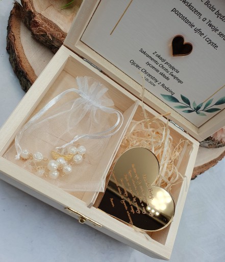 Pamiątka Chrztu Świętego-PREZENT pudełko. Różaniec i serduszko komplet