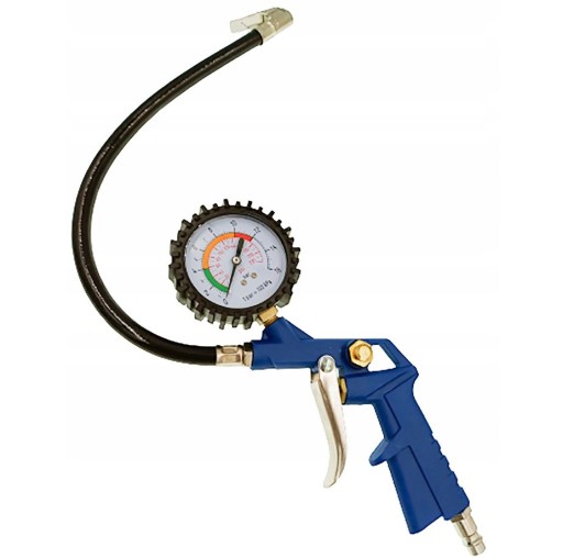 Pistolet do pompowania kół samochodowych. Wyposażony w manometr z wyraźną skalą w dwóch jednostkach pomiarowych (bar i PSI).