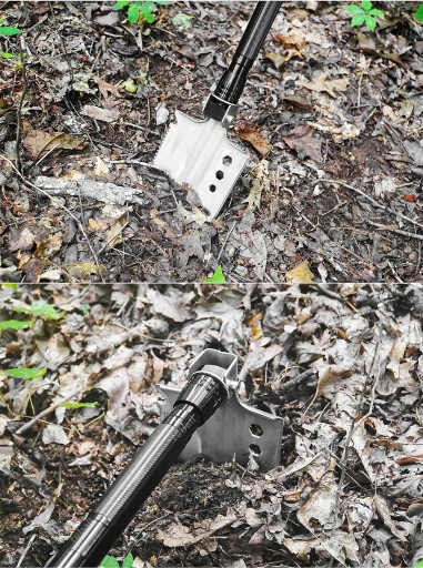 Korpus saperki wykonany został ze stali nierdzewnej o wyjątkowej wytrzymałości, gwarantując niezawodność nawet w najbardziej wymagających warunkach. Trzonek z aluminium łączy lekkość z wytrzymałością, a ergonomiczna rękojeść z trzech skręcanych rur zapewnia komfort i pewny chwyt podczas użytkowania. Po rozłożeniu saperki, szpadel blokowany jest solidnym trzpieniem, co zapewnia stabilność podczas pracy.