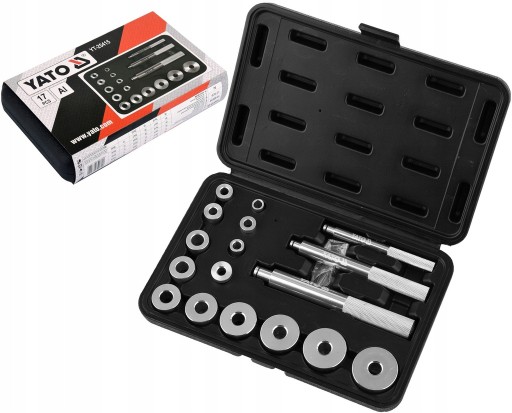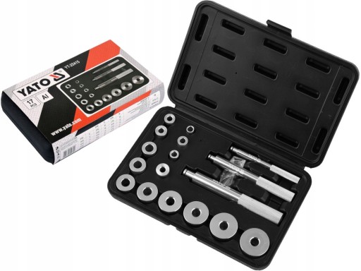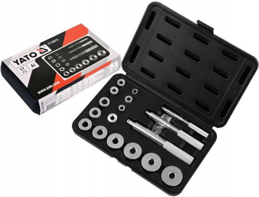 17- elementowy zestaw marki YATO, służący do montażu poprzez pobijanie łożysk oraz uszczelniaczy.