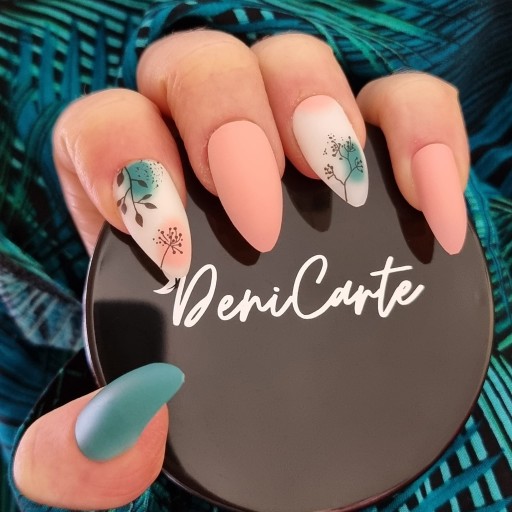 ✔️Wybrany model jest w pięknych matowych odcieniach moreli, zieleni oraz bieli z ozdobnymi czarnymi elementami. Paznokcie w kształcie migdała.