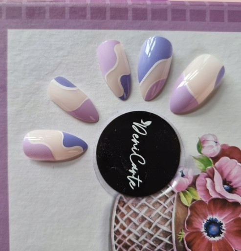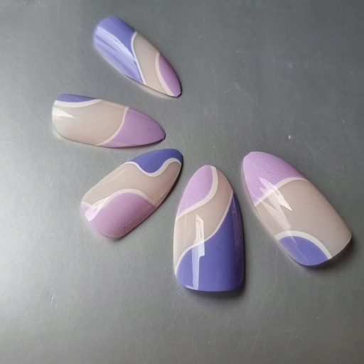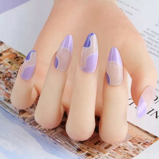 ✔️Wybrany model jest w pięknym błyszczącym kolorze w odcieniach fioletu z ozdobnym motywem swirl. Paznokcie w kształcie migdała.