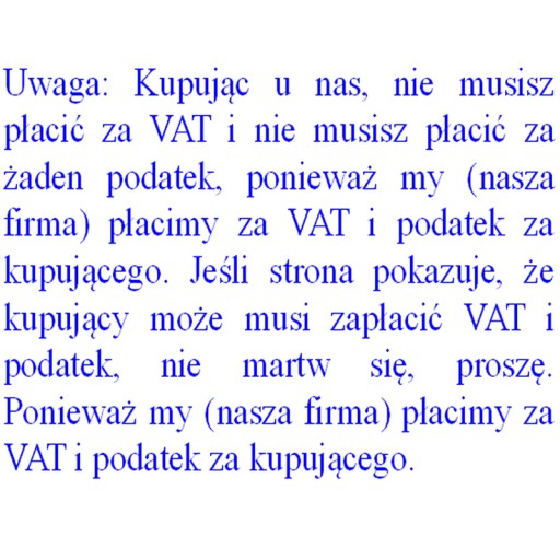Uwaga: Kupując u nas, nie musisz płacić za VAT i nie musisz płacić za żaden podatek, ponieważ my (nasza firma) płacimy za VAT i podatek za kupującego. Jeśli strona pokazuje, że kupujący może musi zapłacić VAT i podatek, nie martw się, proszę. Ponieważ my (nasza firma) płacimy za VAT i podatek za kupującego.